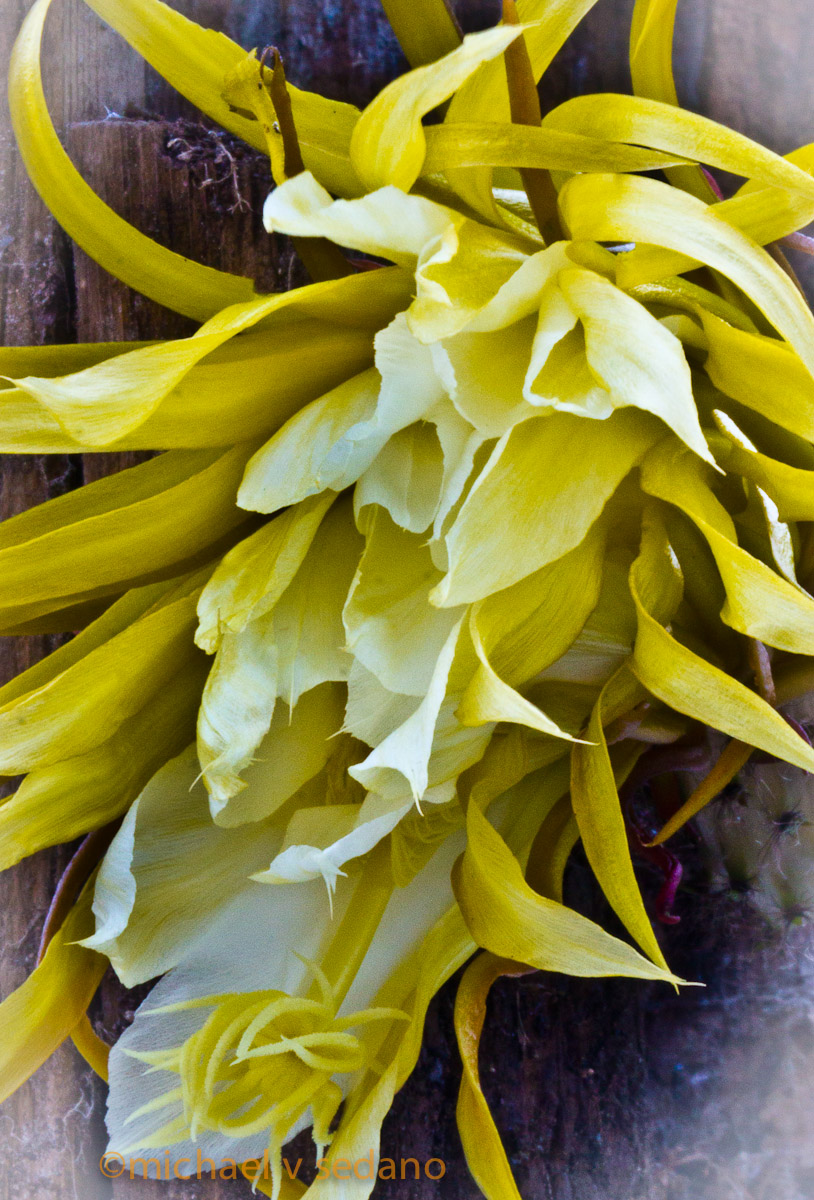 I grow one “Queen of the Night” cactus that opens after dark and fully opens at 1 or 2 in the morning. I can photograph it with 8 minute exposures in distant porchlight. With first light, its delicate petals collapse into wet limp tissue that desiccates to an abstraction. That one's not the “Queen of the Night” featured in today’s Chicano Photography feature on La Bloga-Tuesday.